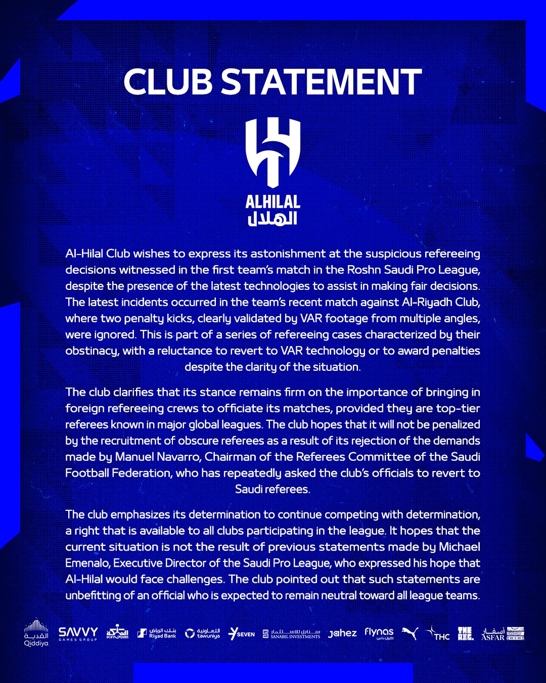 알힐랄 클럽 경영진은 사우디 심판도 경기를 주관한 능력이 있다는 사우디 축구연맹의 반응에도 불구하고 사우디 축구 연맹에 엘리트 심판진으로 구성된 외국 심판단 파견을 공식으로 요청하기에 이르렀습니다.