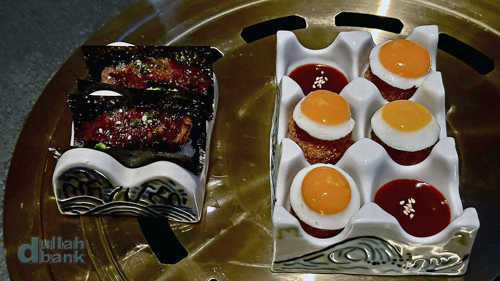 왼쪽에 있는 식전 메뉴는 와규가 얹어진 김밥, 오른쪽에는 김치 아란치니