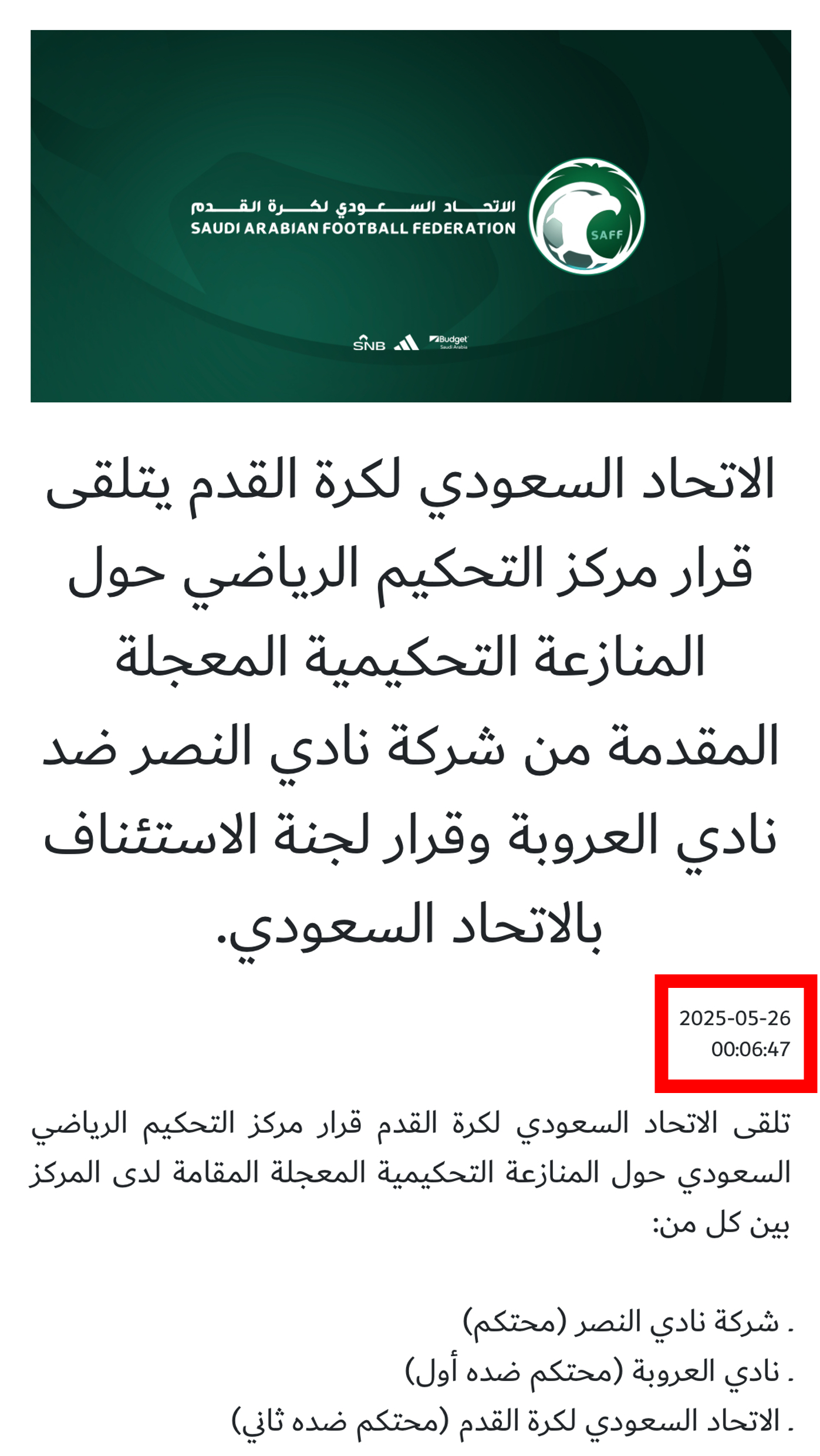 2) 사우디 리그 최종 라운드가 펼쳐지는 당일 자정, 사우디 축구연맹은 2월 28일 열렸던 23라운드 알오루바와 알나스르의 경기 결과를 번복하는 발표를 기가막힌 타이밍이 내놓습니다. 당시 알오루바가 2대1로 승리했지만, 알나스르의 맹공을 잘 막아낸 알오루 골키퍼의 라피 알루와일리의 출전자격을 문제삼은 알나스르의 제소가 스포츠 중재 센터에서 최종 받아들여지면서 알나스르에게 몰수게임승을 안겨준 것입니다. 당초 알나스르의 제소는 한 달 뒤인 3월 29일 사우디 축구연맹의 항소위원회에서 기각되었으나, 알나스르가 이 문제를 긴급 중재 분쟁으로 스포츠 중재 센터에 제소해 버렸고, 중재 센터는 기각 결정을 취소시켜 버렸는데... 이미 널리 알려진 그 결과를 자정이 넘은 경기 당일 12:06에 최종 공지한 것입니다.