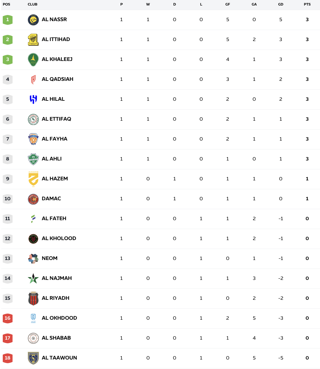 3) 알힐랄의 불참으로 뒤늦게 출전이 확정된 슈퍼컵에서 완벽한 경기력을 선보이며 우승을 차지했던 알아흘리와 백투백 승격을 통해 민영화된 후 두 시즌 만에 3부 리그에서 역사상 첫 1부 리그 무대 데뷔전을 치룬 네옴의 경기에서는 이반 토니의 결승골을 앞세운 알아흘리가 힘겨운 1대0 승리를 거뒀습니다. 승격팀임에도 이번 여름 이적시장에서 가장 많은 이적료를 지출한 네옴은 알까드시야와 알나스르를 발랐던 알아흘리를 상대로 팽팽한 경기를 펼치면서 앞으로의 활약을 기대하기엔 충분한 데뷔전이었습니다.