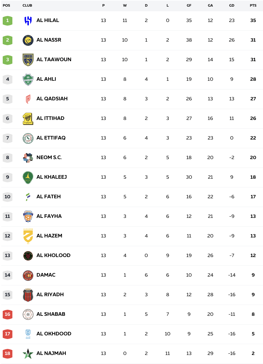 5) 지난 라운드에서 패배를 당했던 알타아운과 3연패에 빠진 알샤밥의 경기에서는 로저 마르티네즈의 결승골을 앞세운 알타아운이 2대0으로 승리하고 알샤밥을 4연패에 빠뜨리며 알까드시야에게 패한 알나스르와 똑같은 승점 31점을 달성했습니다. 이번 시즌 좀처럼 분위기 반전에 어려움을 겪고 있는 알샤밥은 오늘 경기에서도 선수 두 명이 퇴장당하며 스스로 자멸했습니다.