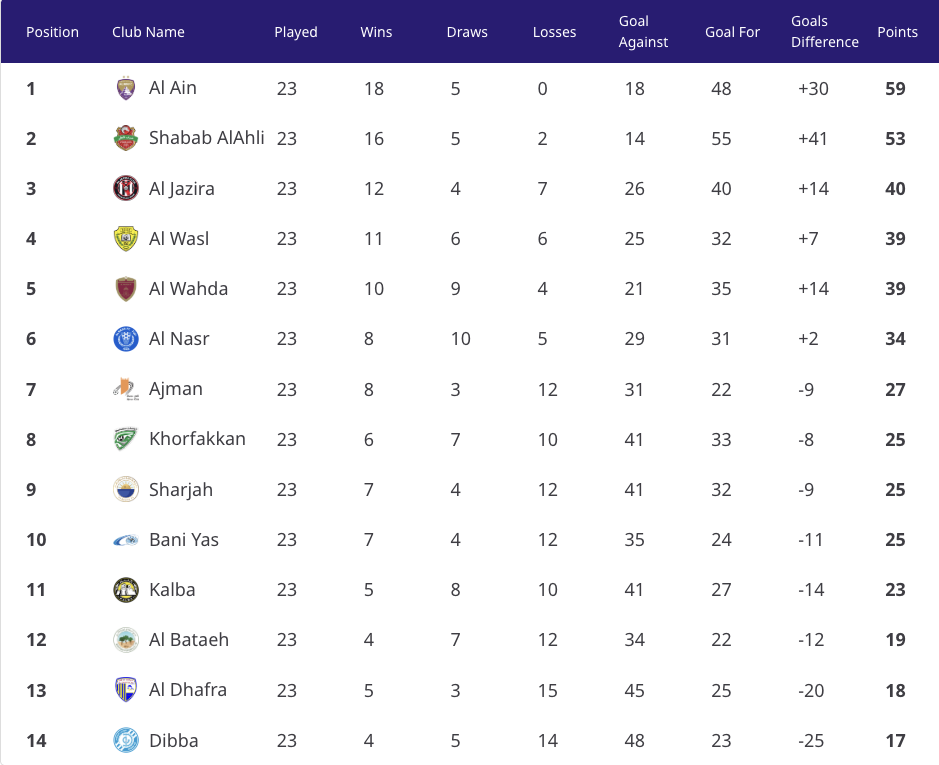 8) 리그 종료까지 3경기를 남겨놓은 가운데 23라운드 결과 알아인의 승리와 샤밥 알아흘리의 무승부로 두 팀 간의 승점차가 4점에서 6점차로 벌어지면서 알아인은 남은 세 경기에서 1승만 거두면 네 시즌 만의 리그 우승을 확정짓게 됩니다. 알아인은 리그 우승을 향한 9부 능선을 넘은 가운데, 관건은 무패 우승을 달성할 수 있을까에 관심이 더 쏠릴 것으로 보입니다.